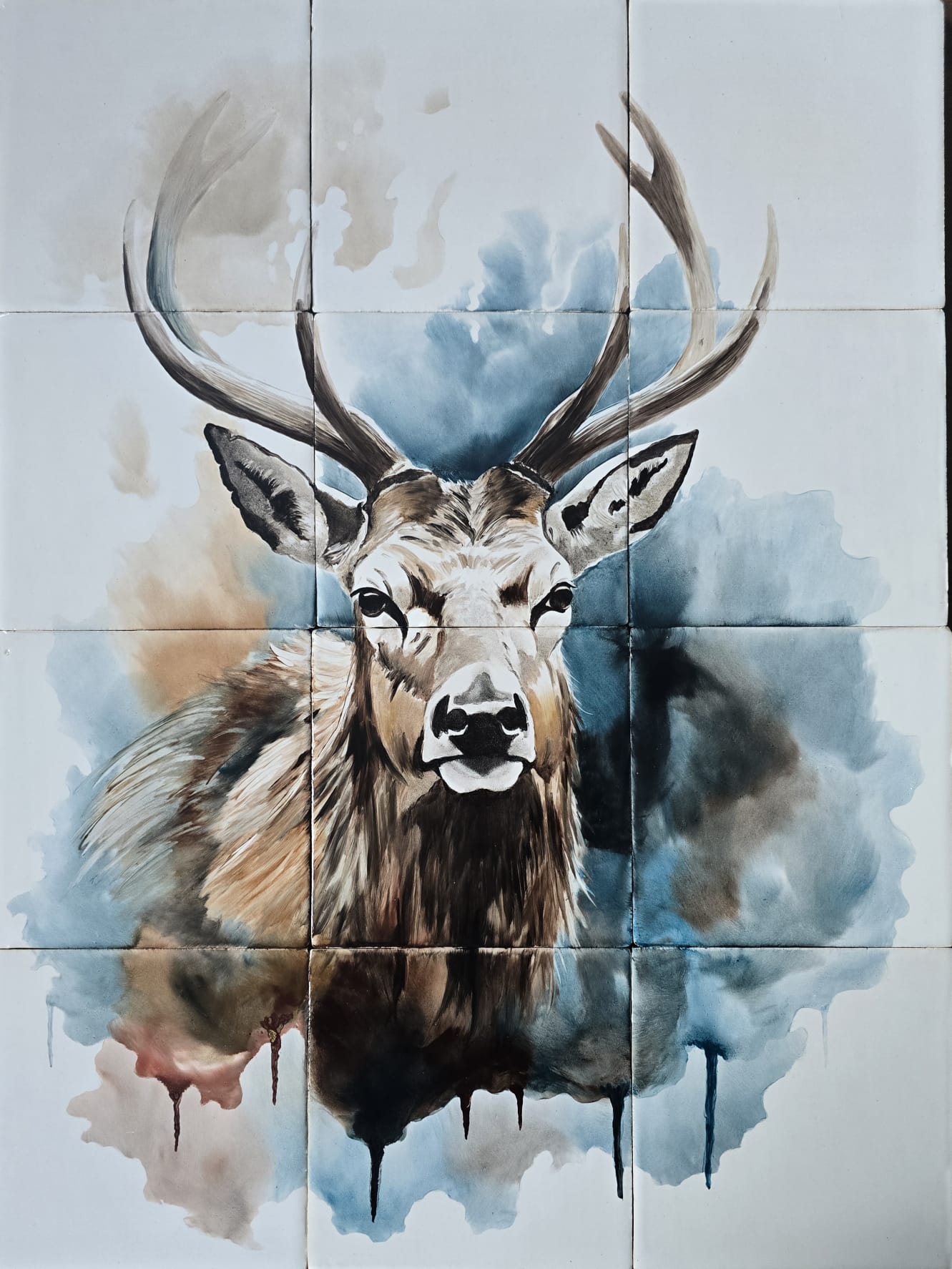 Een edelhert met imposant gewei, vastgelegd in aquareltinten op authentieke Friese witjes. Dit handgeschilderde tegeltableau brengt de magie van de Nederlandse natuur naar jouw interieur. Het tableau bestaat uit 12 tegels en is volledig met de hand beschilderd volgens traditionele technieken.