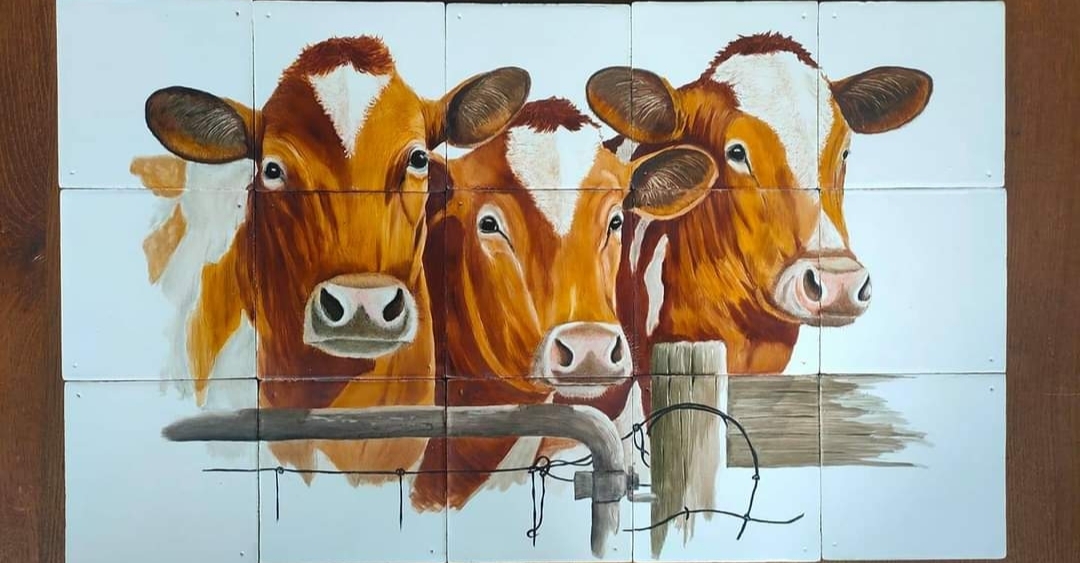 Dit tegeltableau toont de koppen van drie roodbontkoeien achter een hek. De expressieve gezichten en het hek vangen de landelijke sfeer op een minimalistische manier, waardoor het tableau een charmante uitstraling heeft. Het tegeltableau bestaat uit 15 Friese witjes.
