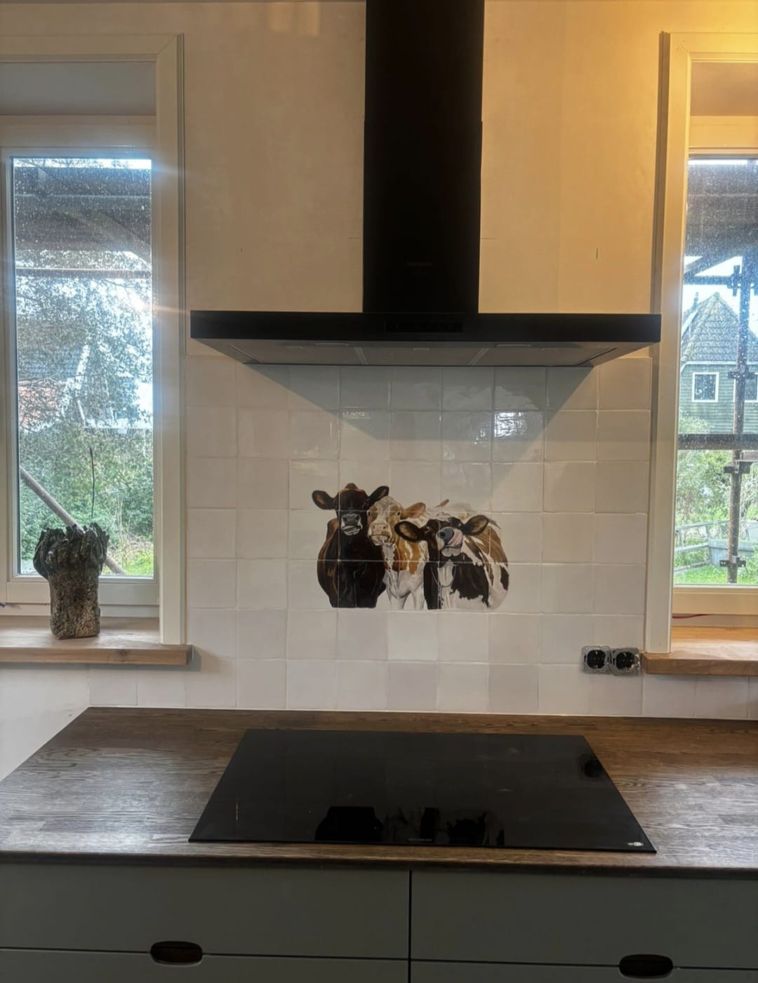 Een tegeltableau toont drie nieuwsgierige koeien die met levendige uitdrukkingen naar voren kijken. Van nieuwsgierigheid tot speelse tonguitsteken, elk detail brengt een glimlach op je gezicht.