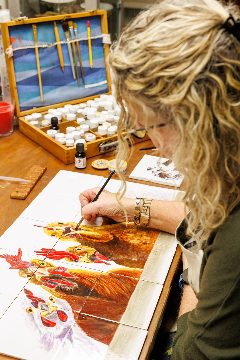 Dit tegeltableau is vervaardigd volgens traditionele technieken waarbij elke tegel afzonderlijk wordt beschilderd voordat het geheel wordt samengesteld. De warme ...