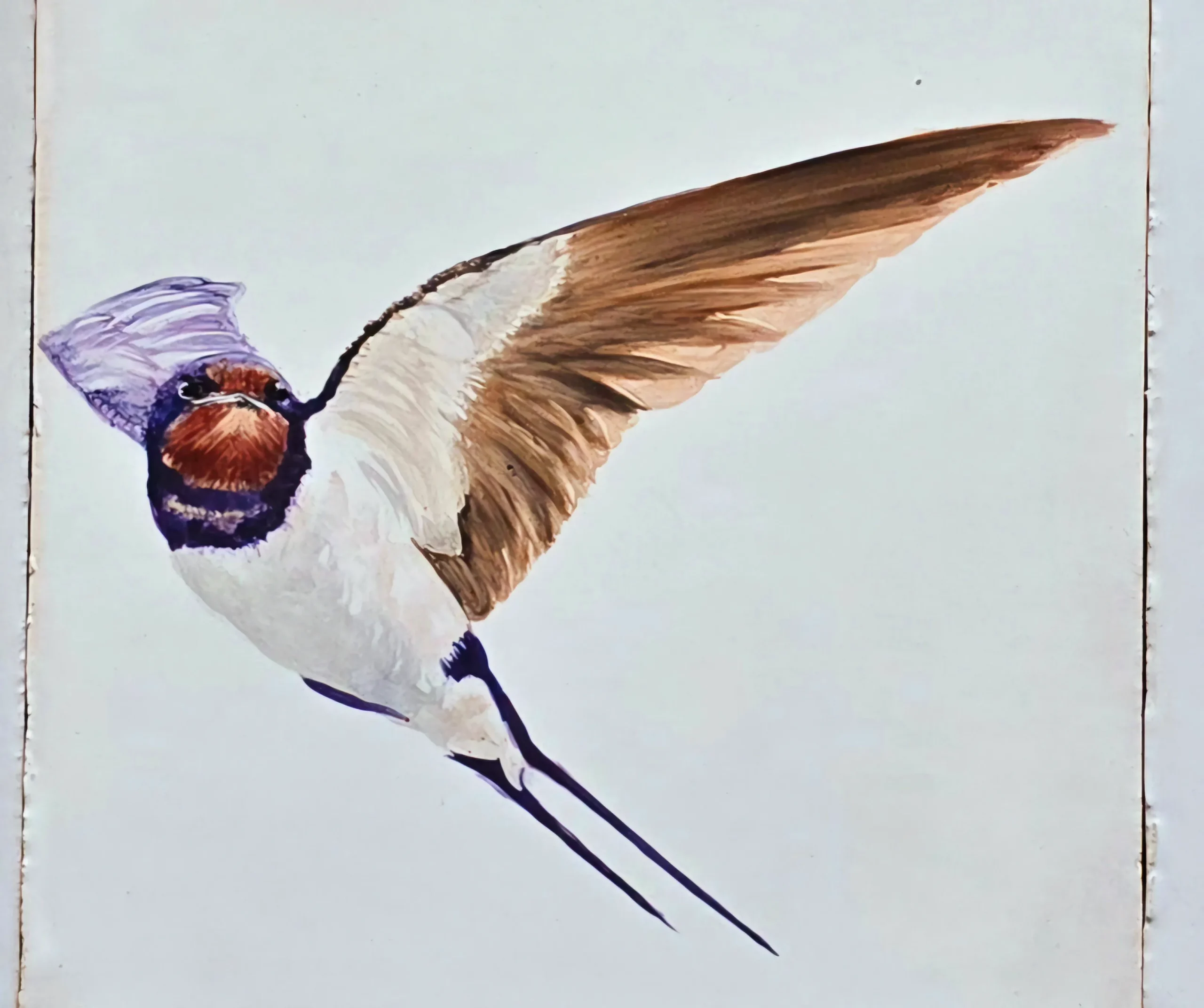 Een elegante zwaluw zweeft door de lucht met sierlijk uitgespreide vleugels. Dit tegeltableau vangt het gevoel van vrijheid en beweging met verfijnde penseelstreken.