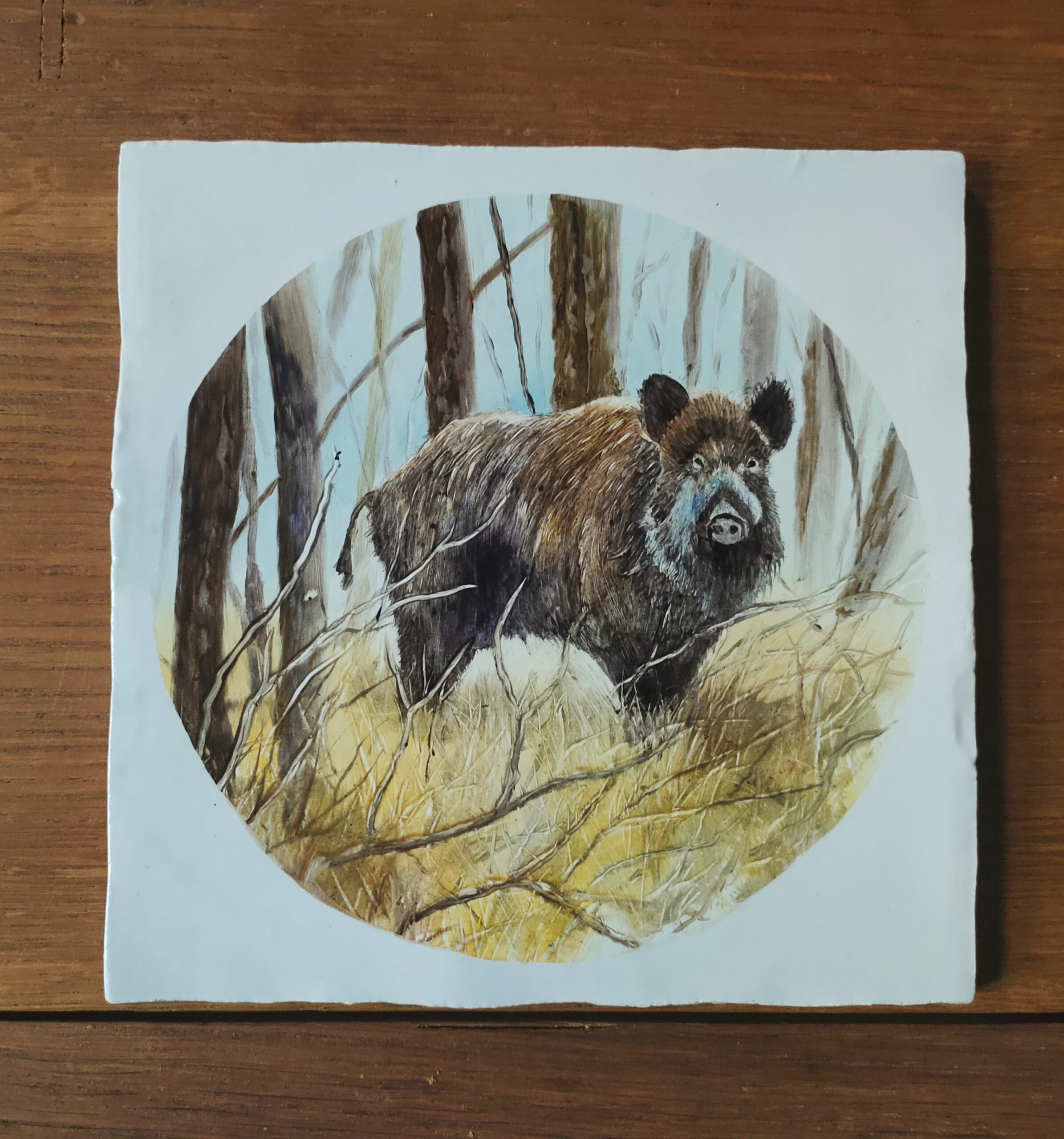 Een wild zwijn staat krachtig in het hart van een winterbos, omringd door hoge, kale bomen en dorre grassen. Het dier straalt zelfvertrouwen uit, alsof het zich volledig bewust is van zijn omgeving. De rustieke achtergrond van het bos voegt een gevoel van tijdloze sereniteit toe